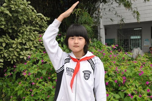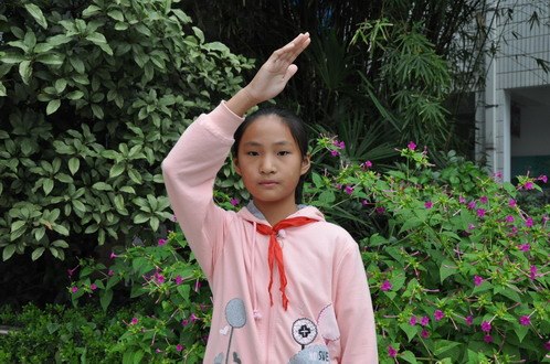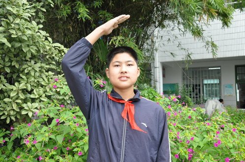 今天,介绍的光荣升旗手,他们都是本次区田径运动会上的金牌选手,他们分别是六(4)班刘常玉获女子乙组400m 800m,2块金牌、六(4)班李庸获男子甲组80m栏金牌、六(1)时成龙获男子甲组垒球金牌、六(3)孔凯悦获女子甲组800米金牌,这跟他们长年参加刻苦训练是分不开的,毫不夸张地说,他们一天出的汗比普通同学一天喝的水还要多,请大家向他们学习,学习他们吃苦耐劳,顽强拼搏的精神。